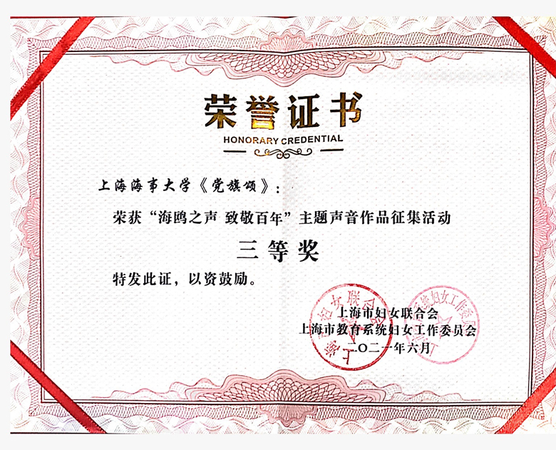 6月27日,“巾声有约 致敬百年”庆祝建党100周年声音作品志愿宣讲暨“海鸥之声”上海市女大学生优秀声音献礼作品颁奖汇演在上海市妇女儿童服务指导中心(巾帼园)举行。我校选送的相苹钰同学获一等奖,王栩涵同学获三等奖。